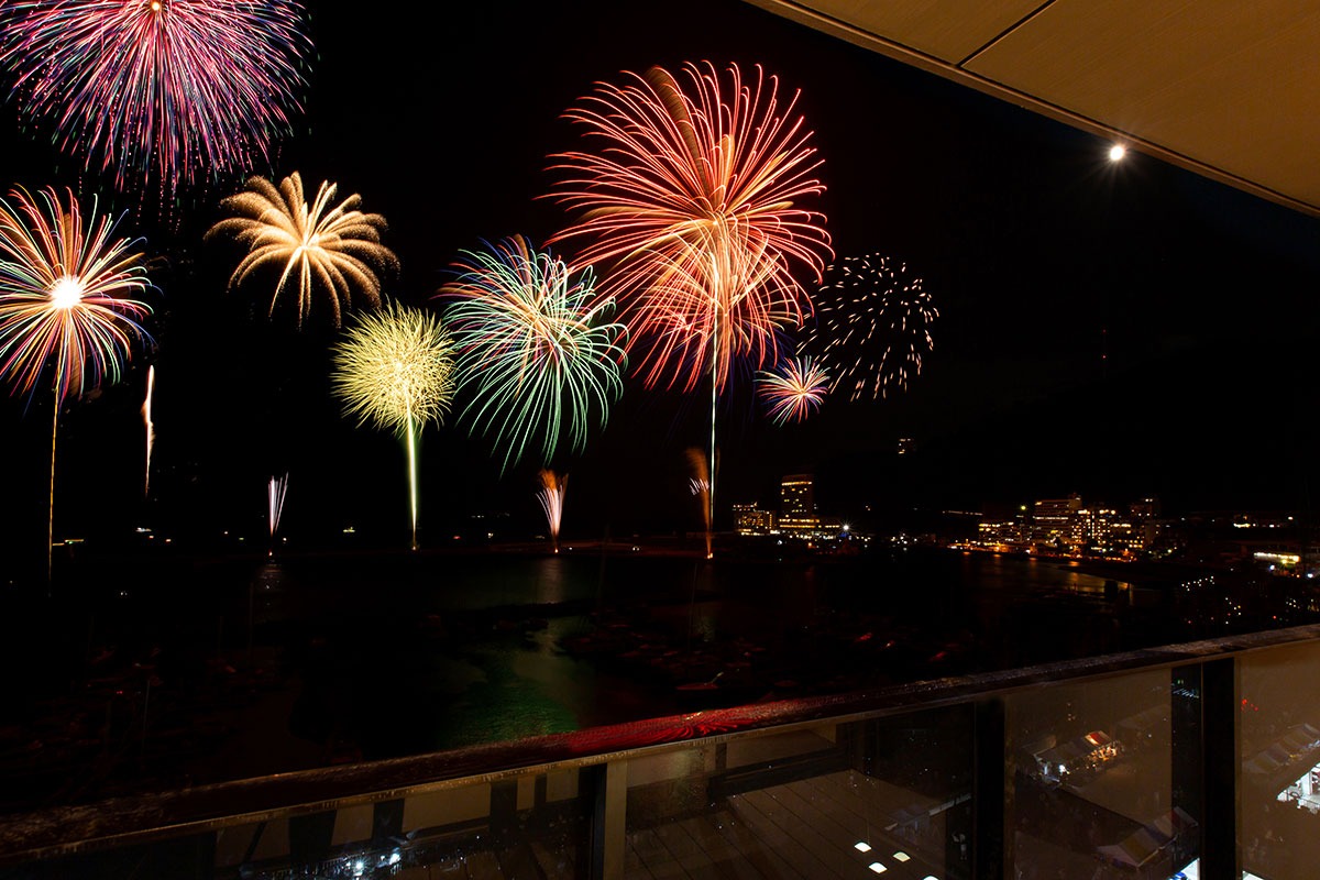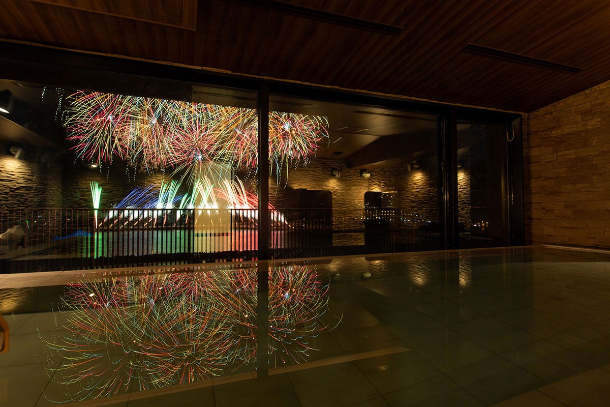 視界いっぱいに海が広がるオーシャンフロント客室は、まるで花火のための特等席。